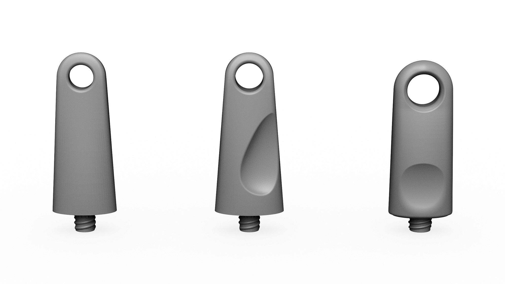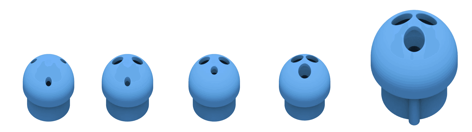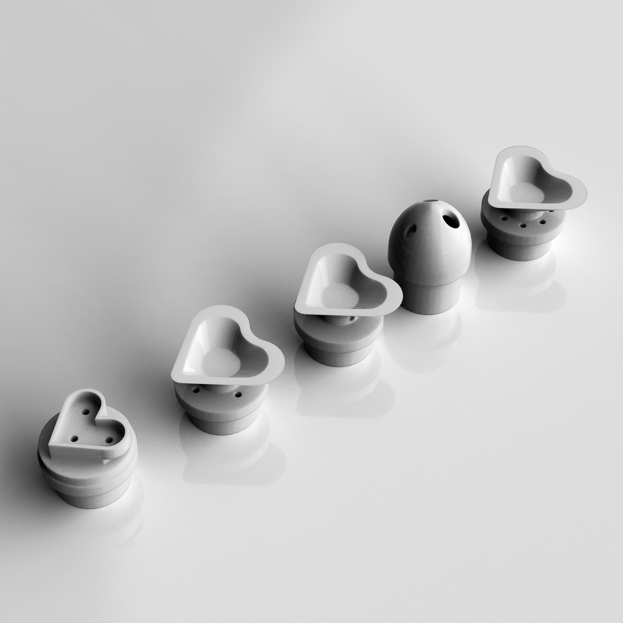 Initial nozzle variations (CAD) 5 nozzle variations. Different cavity shapes, hole placements, dispensing angles. All designed to output a clean heart shape.
