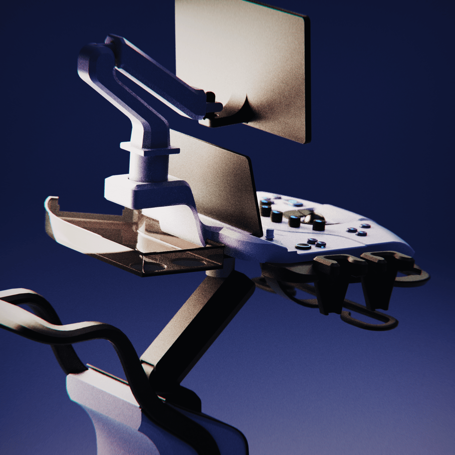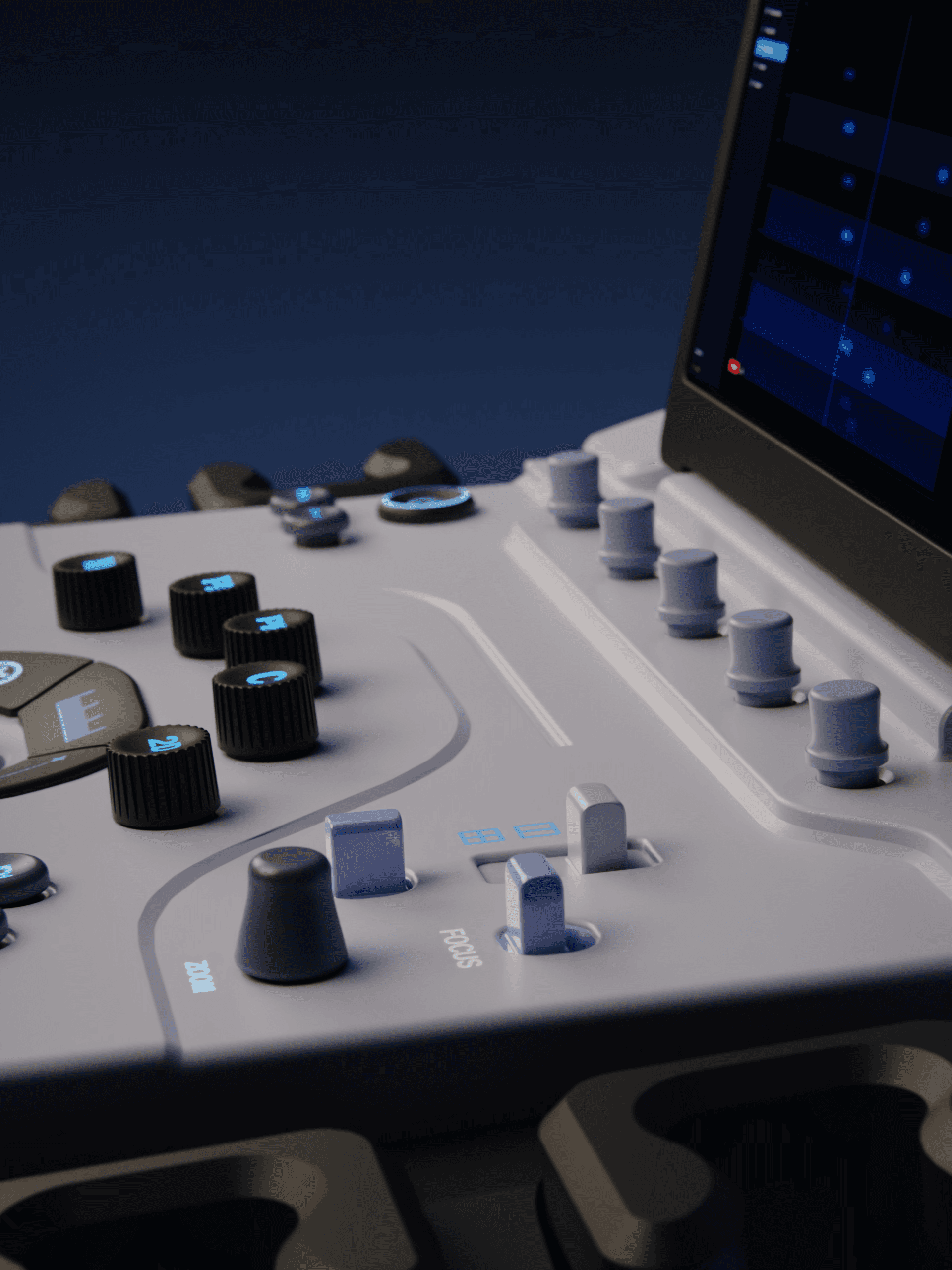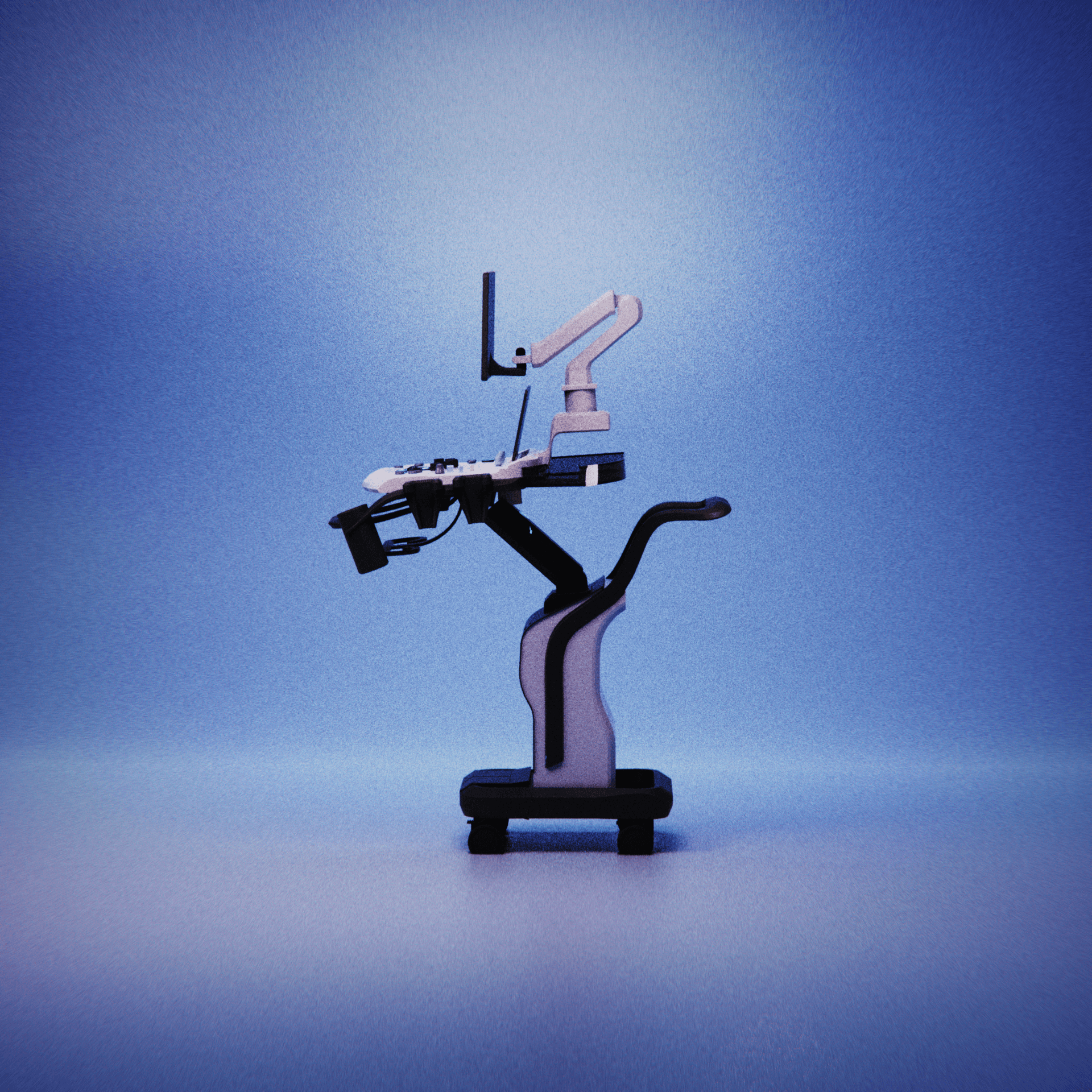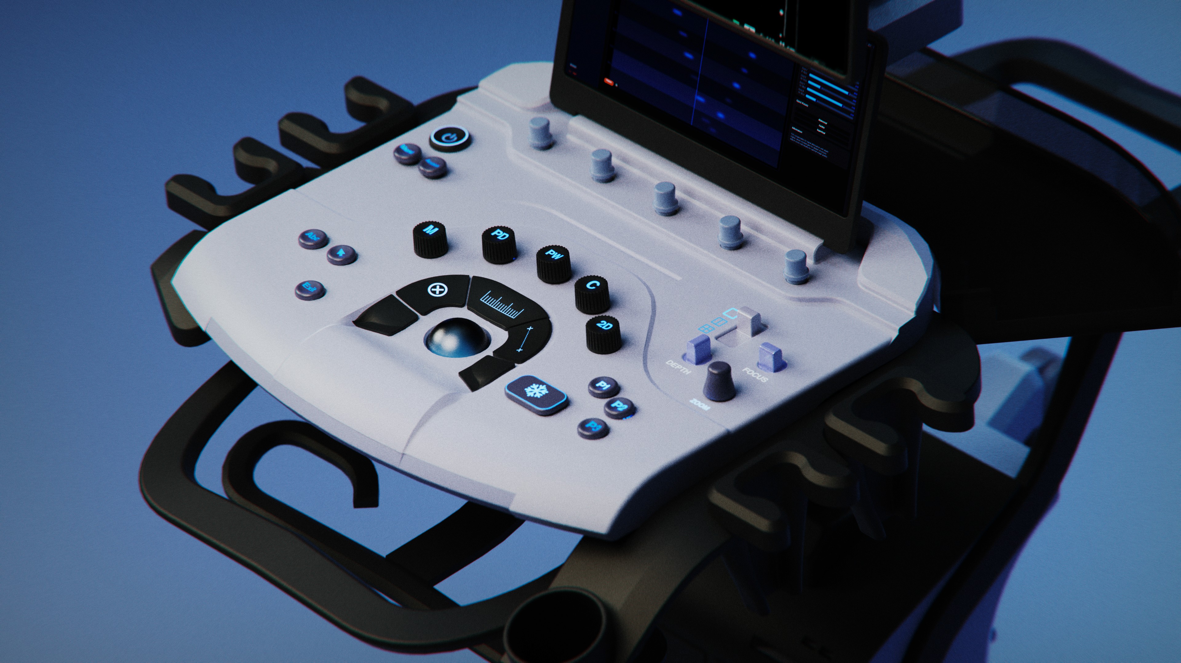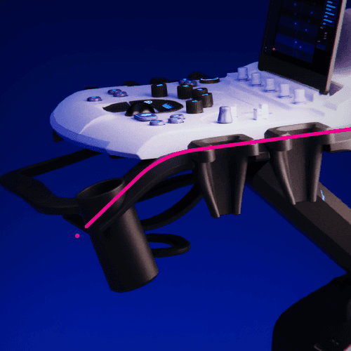 A redesigned cart-based ultrasound machine with a focus on the control panel. By introducing height as a third dimension to the UI language, the learning curve reduces significantly, letting operators navigate the machine by feel, keeping their attention where it belongs: on the patient.